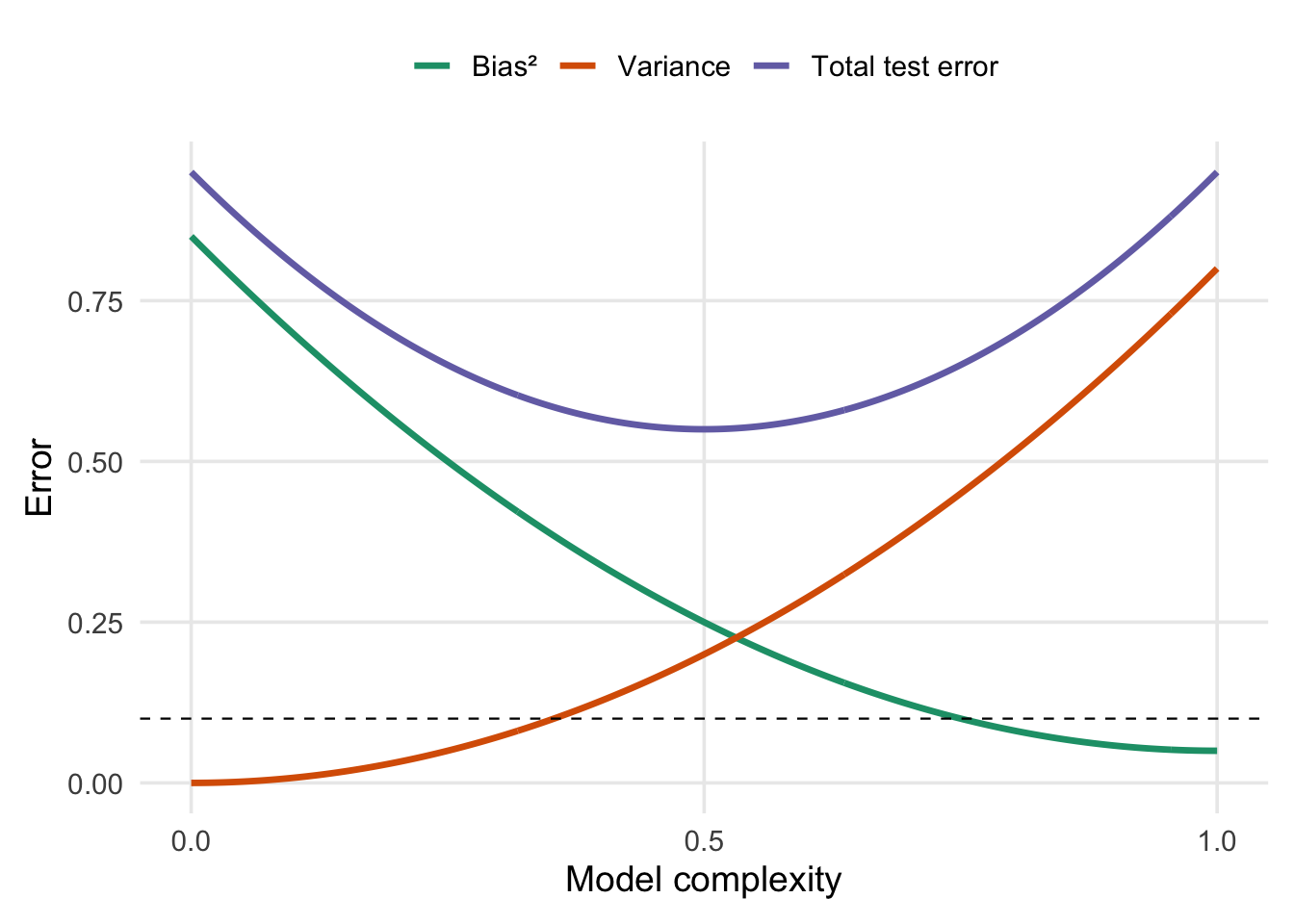 So now we see the details of the earlier claim that predictive performance is a function of both variance and bias of the estimates.